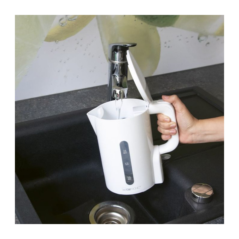 The Clatronic WK 3834 is a 1-liter electric kettle with a power of 900 W. It has a removable filter, overheating protection and a water level indicator for convenient use.