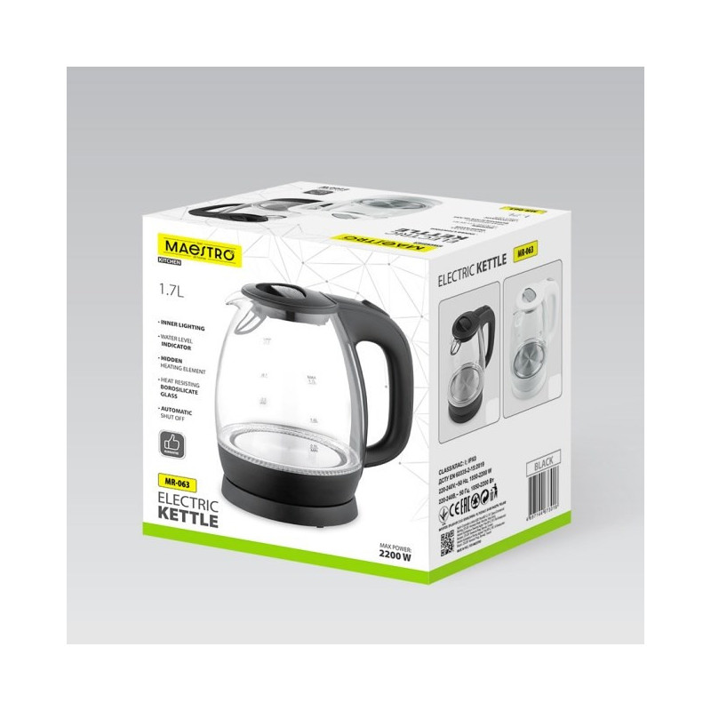 The Maestro MR-063-WHITE glass electric kettle has a 1.7 L capacity and a maximum power of 2200 W. It features a transparent glass body with a lever control type and has an automatic shut-off function for safety.