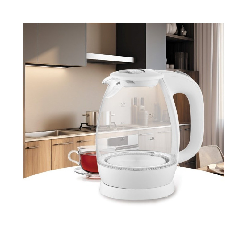 The Maestro MR-063-WHITE glass electric kettle has a 1.7 L capacity and a maximum power of 2200 W. It features a transparent glass body, lever control type, and an automatic shut-off function that ensures safety.