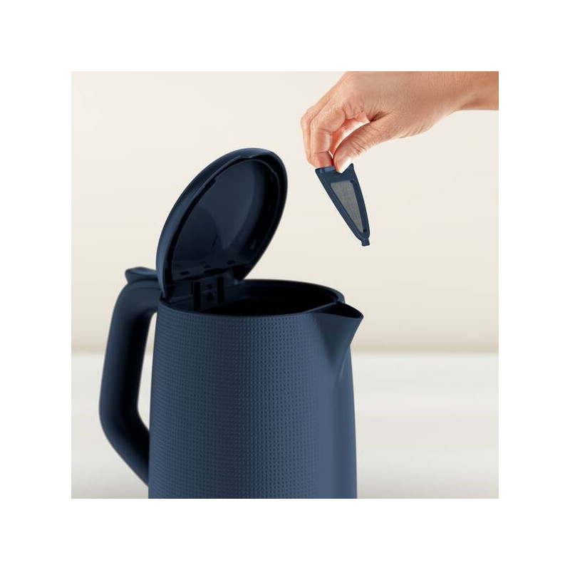 The Tefal KO2M04CH electric kettle has a 1.7 L capacity and a power of 2400 W. It has an anti-limescale filter and an automatic shut-off function for safety.