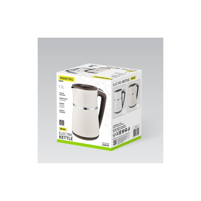 The Feel-Maestro MR030 electric kettle has a 1.7 L water capacity and operates at a maximum power of 2200 W. It has an automatic shut-off function for safety and is made of plastic and stainless steel.