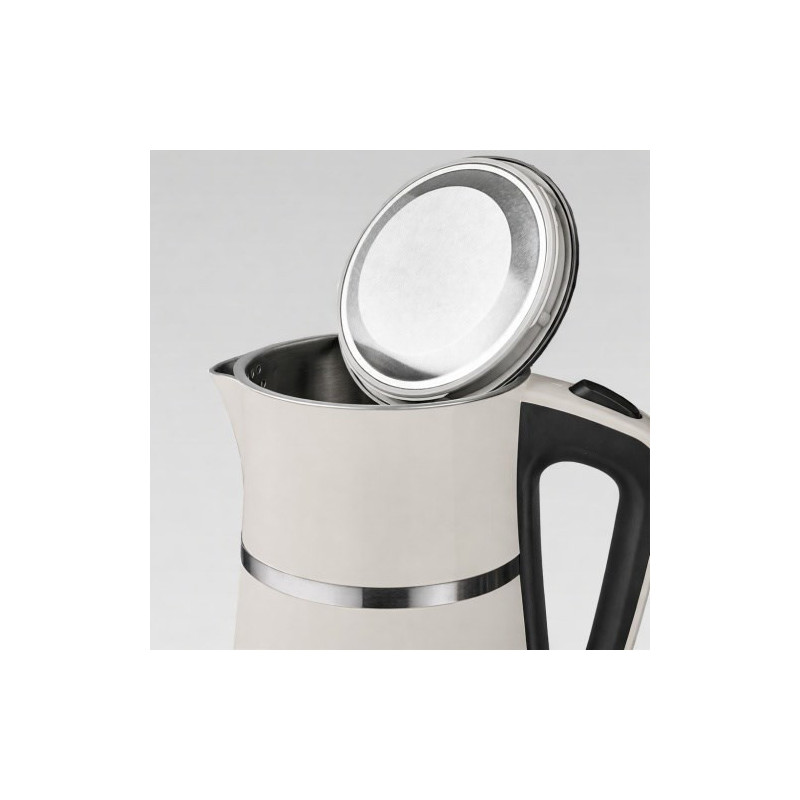 The Feel-Maestro MR030 electric kettle has a 1.7 L water tank and operates at a maximum power of 2200 W. It features an automatic shut-off function for safety, and its body is made of plastic and stainless steel.