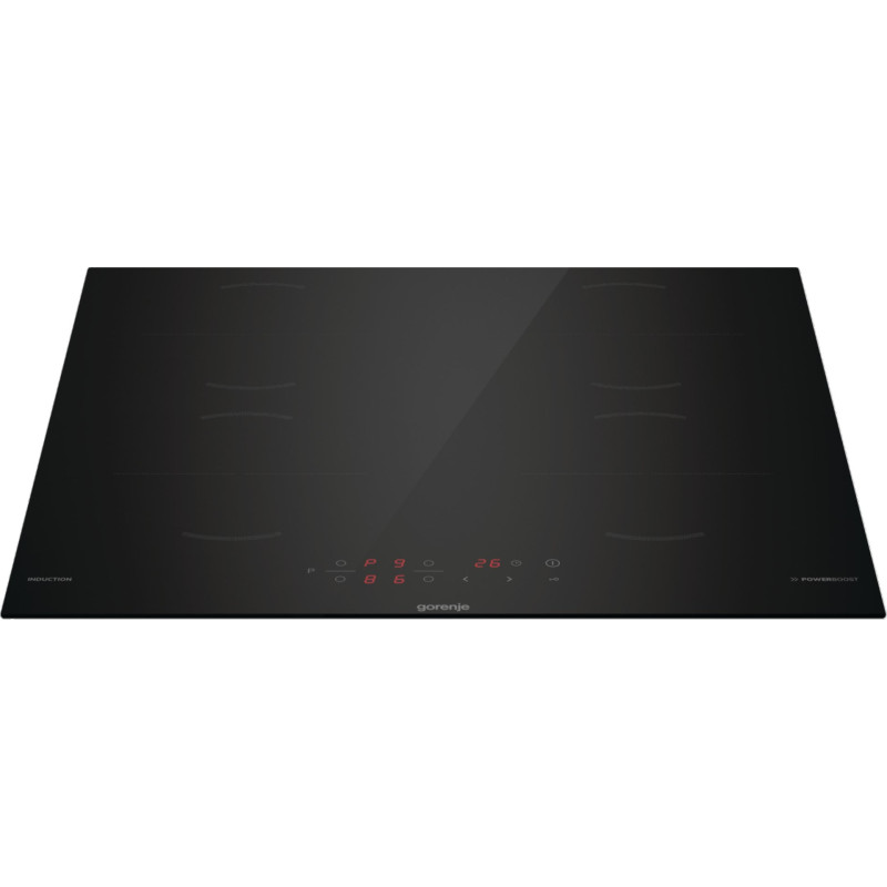 The Gorenje GI6401BSCE is a black built-in induction hob with four electric cooking zones, each with a diameter of 180 mm. It features a touch control panel, an integrated display and safety features such as overheating protection and a child lock.