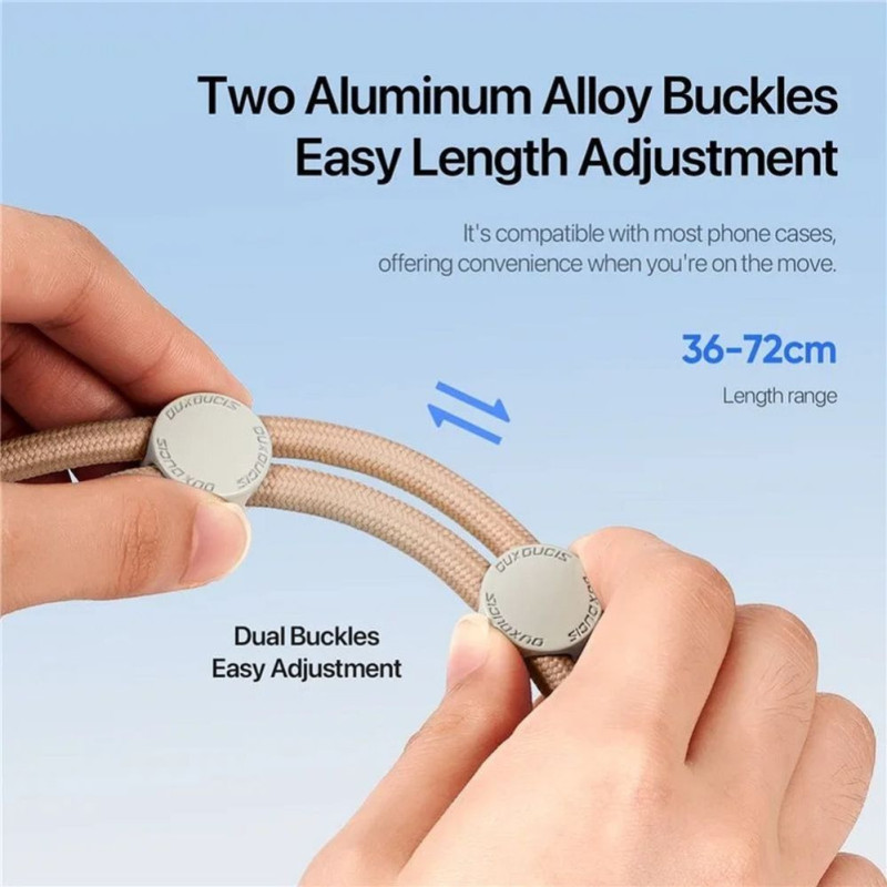 The DUX DUCIS Plaz lanyard offers easy length adjustment from 36 to 72 cm, making it suitable for people of different heights and wearing style preferences. This makes the lanyard extremely versatile, providing comfort in everyday use, both during walks and physical activities. Two buckles made of aluminum alloy guarantee solid hold and safety of the phone.