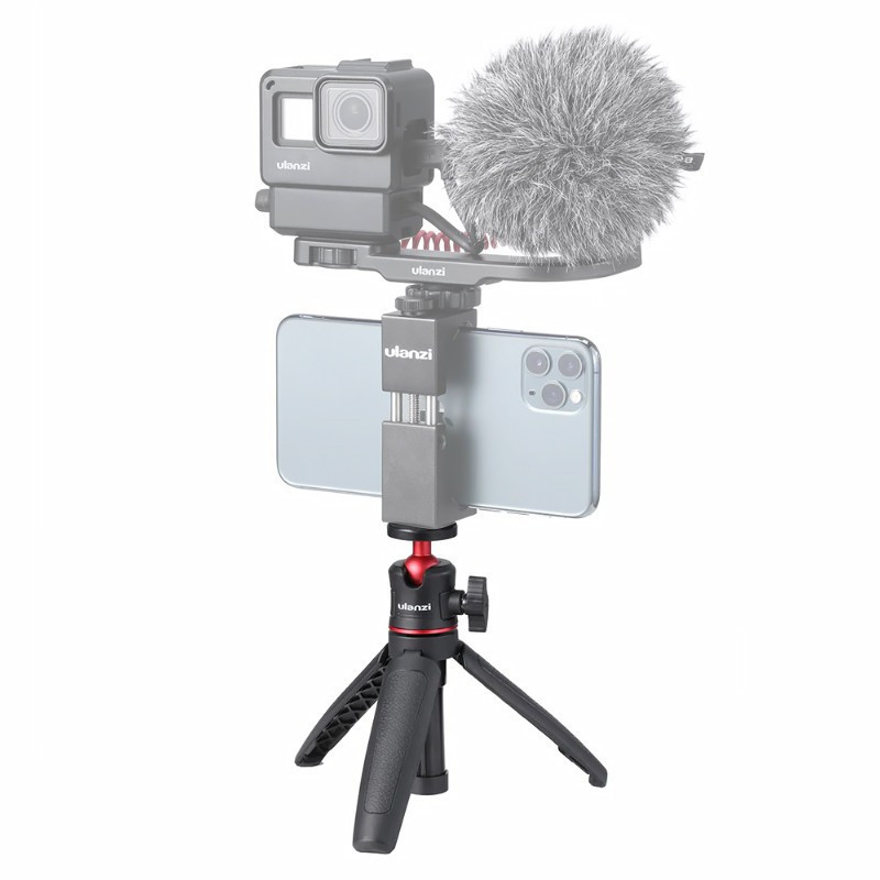 ULANZI MT-08 is a mini tripod that combines a tabletop tripod and a selfie stick. It has a ball head with a 1/4' mounting thread and a maximum height of 24 cm when fully extended.