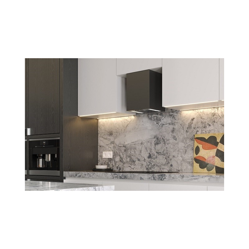 The MAAN ELBA MINI WPB 430 BLACK kitchen hood features a steel body with a black surface and electronic controls, including a remote control. Its diameter is 300 mm, height - 400 mm, and the noise level reaches 60 dB, energy efficiency class - C.