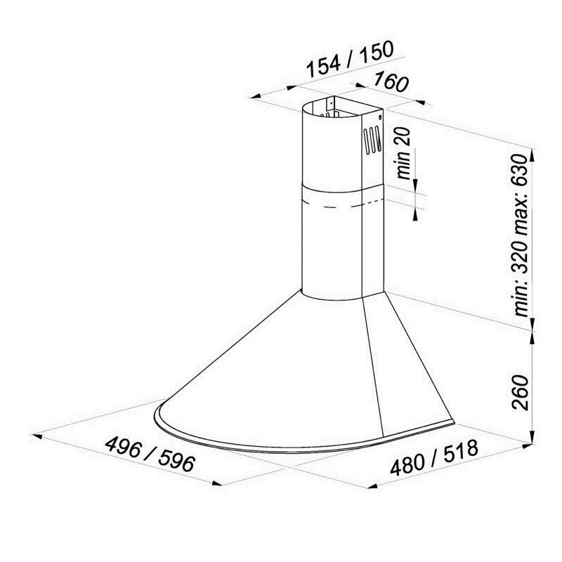 Wall-mounted hood with a maximum extraction capacity of 310 m³/h and three speed settings. Features: white steel housing, front control and washable aluminum grease filter.