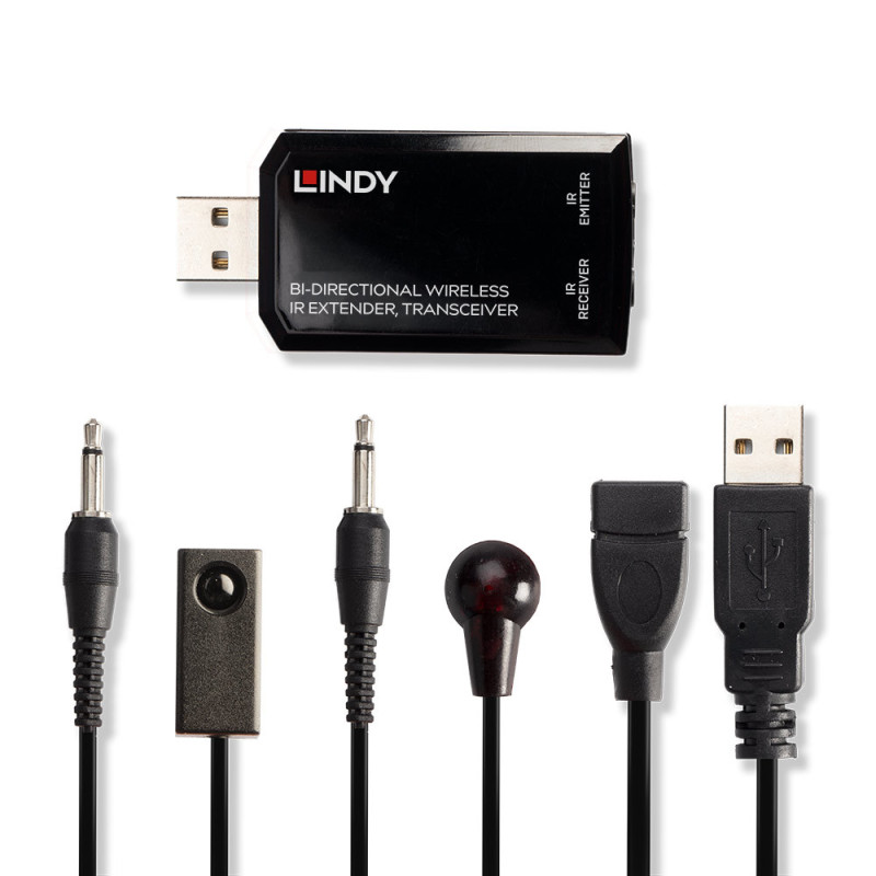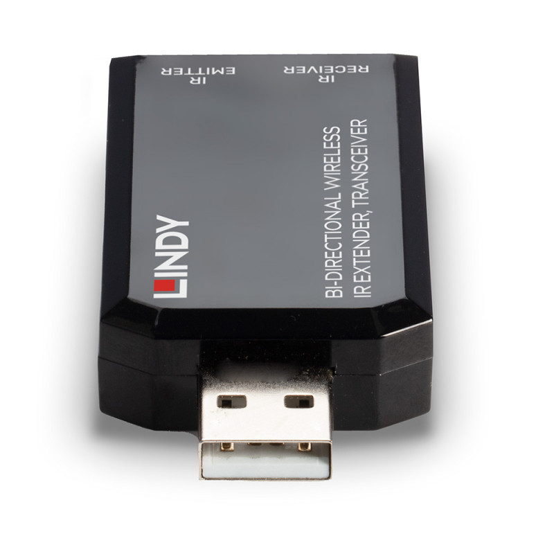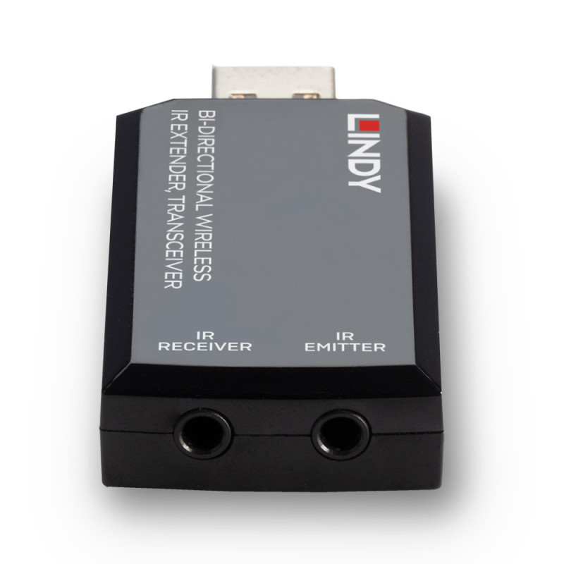 The two-way wireless IR extender transmits IR signals up to 150 meters using 866MHz RF technology. It features a two-way 3.5mm IR port and is powered via USB.