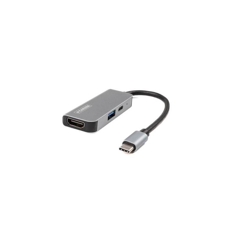 The 3 in 1 USB C Hub features one PD port for fast charging, one USB A 3.0 port with 5Gbps data transfer speed, and one HDMI port supporting 4K/30Hz output. The compact design includes a 15.5cm cable and comes with a 3-year warranty.