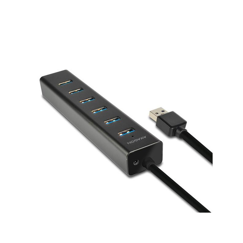The seven-port AXAGON HUE-SA7BP ALU CHARGING USB 3.0 hub with own power and fast charging support on all USB ports.