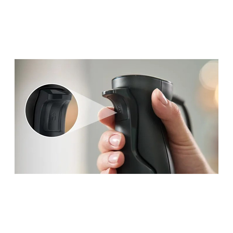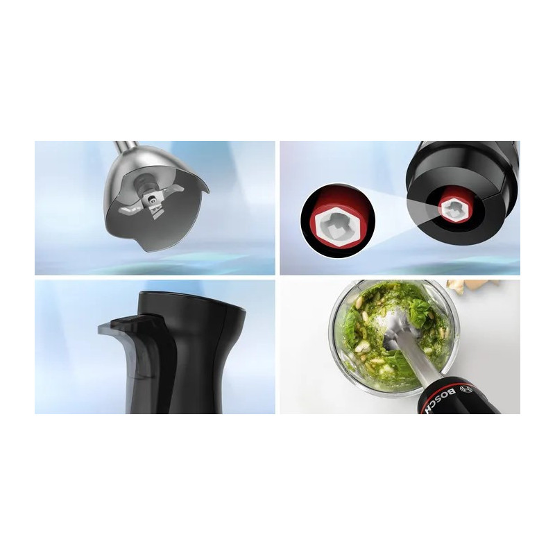 The Bosch Serie 4 MSM4B6V2 is a 1000 W hand blender with a 1.2 L capacity. It has a removable blade unit, an ergonomic handle and dishwasher-safe parts, making cleaning easy.