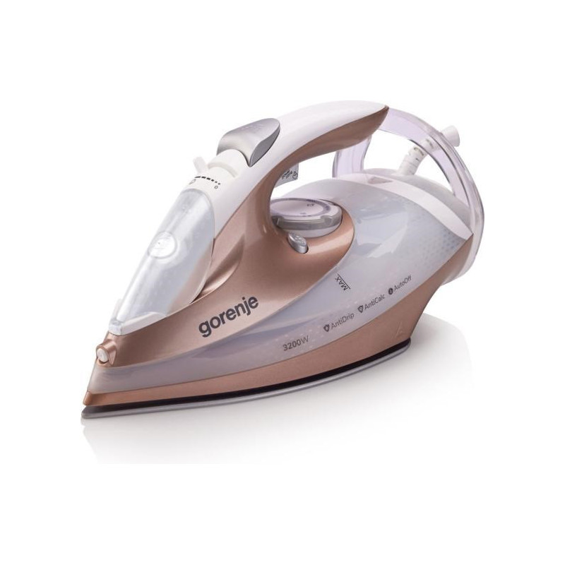 The Gorenje SIH3200WR steam iron has a power of 3200 W and a 0.42 liter water tank. Key features include vertical steam function, automatic shut-off and a ceramic soleplate with a steam boost of 250 g/min.