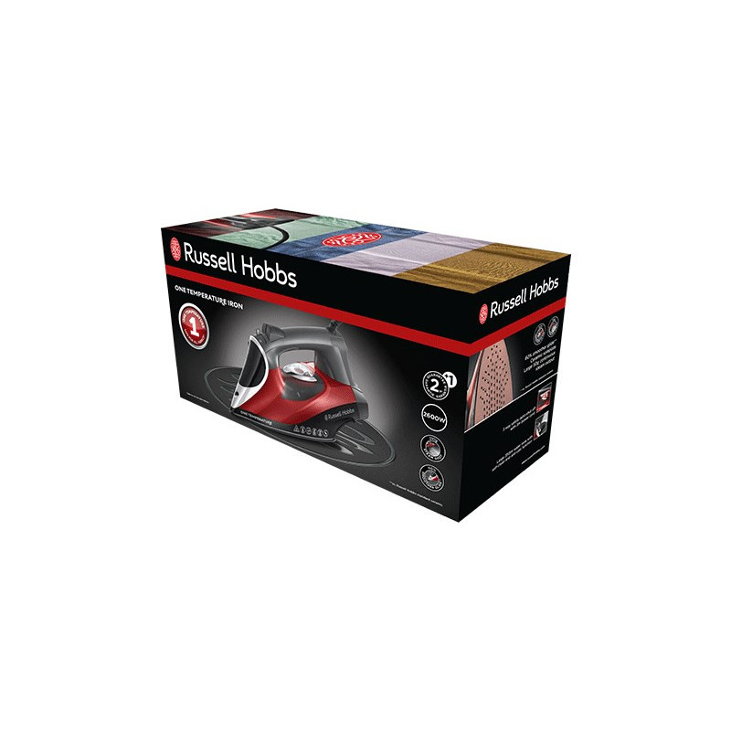 The Russell Hobbs One Temperature Iron has a ceramic soleplate and a powerful steam boost of 210 g/min. It has a 3 m cord, a 0.35 l water tank and 2600 W of power.