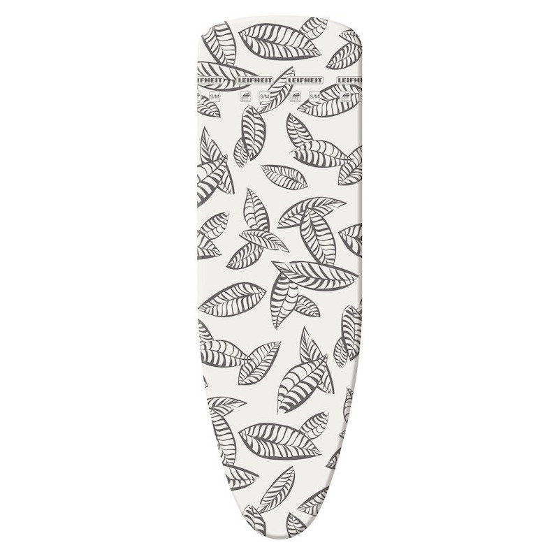 The Leifheit Perfect Steam Air Board Express M has a padded cover made of foam with a multi-colored leaf pattern. It is 1250 mm wide and 400 mm deep, designed for standard ironing boards.