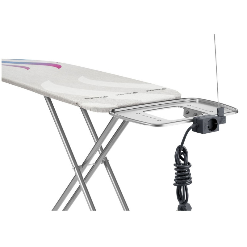 Full-size ironing board with a reflective surface for efficient ironing. Adjustable height and sturdy frame construction for stability.