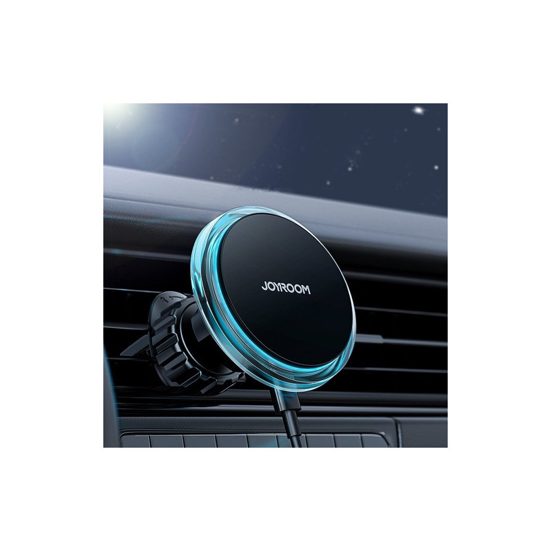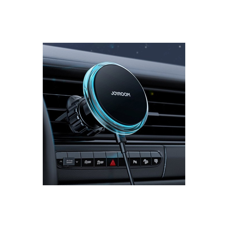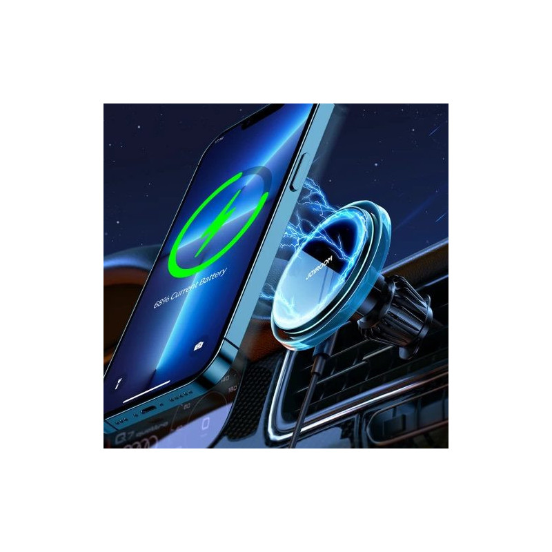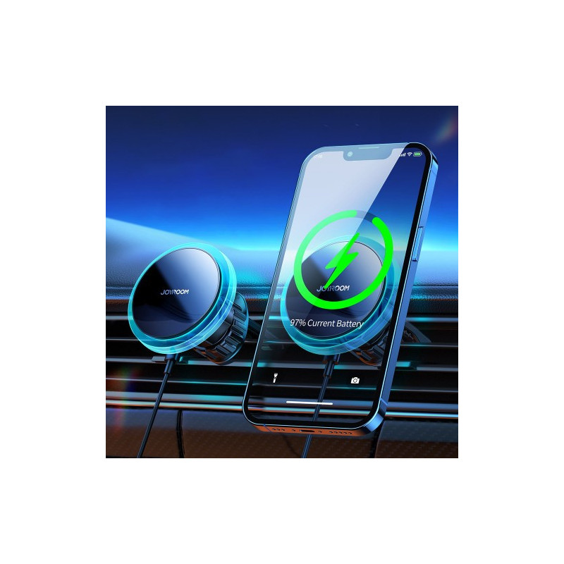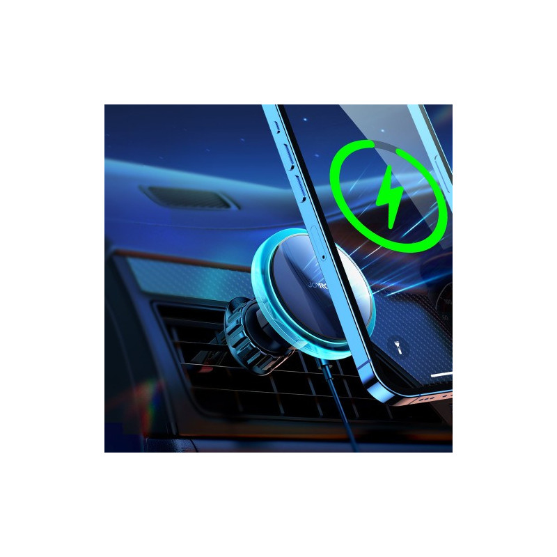 An elegant car phone holder with an inductive charger compatible with MagSafe technology - Joyroom knows how to combine design with functionality. The Joyroom JR-ZS291 holder with wireless charging option is equipped with a transparent ring that illuminates blue when you start the car engine. It will certainly fit stylistically into the interiors of modern cars. Inductive charging will charge your phone quickly and safely. The holder has built-in neodymium magnets and special protections that will prevent the devices from overheating. Joyroom JR-ZS291 is also compatible with MagSafe technology, which means you can also charge iPhone 12, 13, 14, 15 series phones with it.