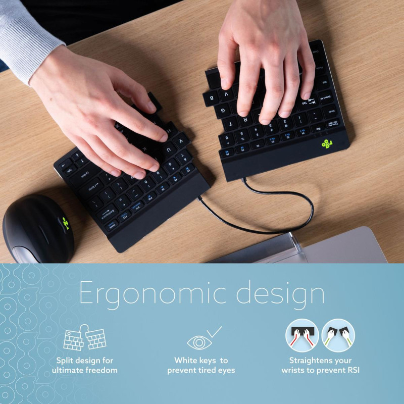 The R-Go Split Break keyboard is an ergonomic split keyboard with integrated break software. This keyboard encourages you to take regular breaks. This keeps your body's blood flowing, prevents strain and keeps you fit during your working day. The keyboard consists of two separate parts, which you can place in any arrangement you like. This splitting prevents a kink in the wrists while typing. Typing with straight wrists reduces muscle tension and prevents pinching of tendons and blood vessels. The built-in magnet allows you to turn the two separate parts of the keyboard into a compact keyboard with one move. The compact size ensures that the mouse is always within reach. The light keystroke means minimal muscle tension is present while typing. The keyboard is flat, keeping your hands and wrists flat and relaxed while typing. LED colour signals in the keyboard indicate how healthy you are working and when it is time for a break. As you type, the light changes colour, like a traffic light. Green means 'good job', orange that it is time for a break, red that you have been working too long. Through these subtle colour signals, you receive feedback on your pause behaviour in a simple and positive way. This product works with the R-Go Break Software that won the Benelux Office Product Award 2021.