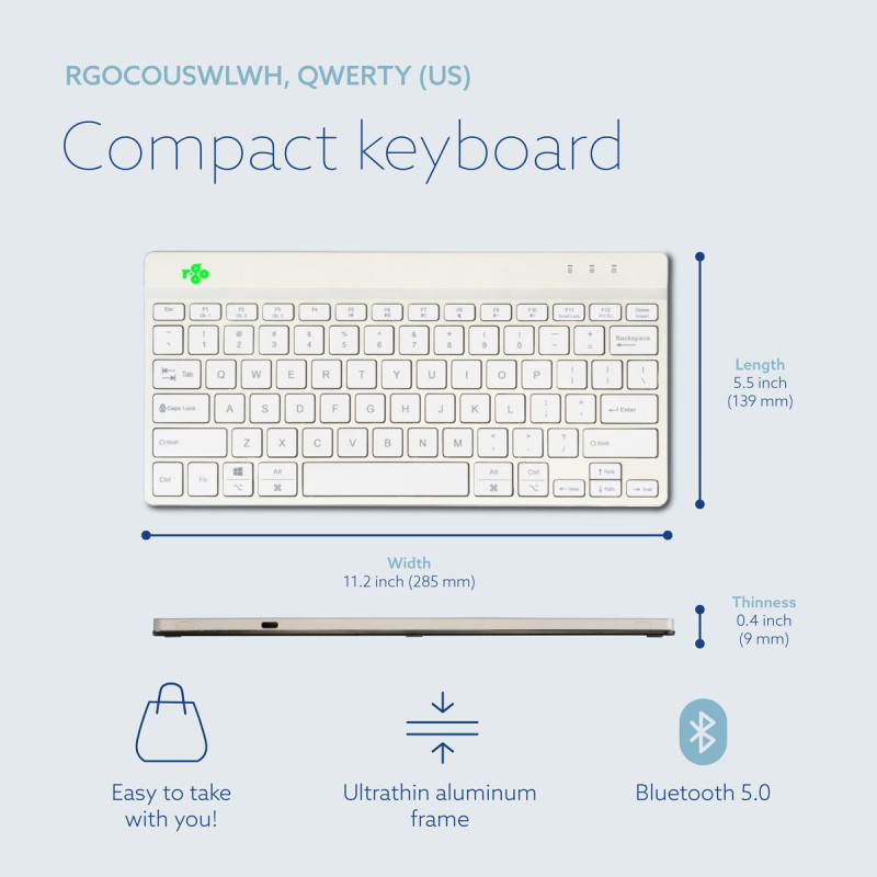 | Summary | R-Go Tools Ergonomic keyboard R-Go Compact Break, compact keyboard with break software, QWERTY (US), Bluetooth, white. Keyboard form factor: Mini. Keyboard style: Straight. Connectivity technology: Wireless, Device interface: Bluetooth, Keyboard key switch: Scissor key switch, Keyboard layout: QWERTY. Cable length: 1.55 m. Recommended usage: Office. Product colour: White |