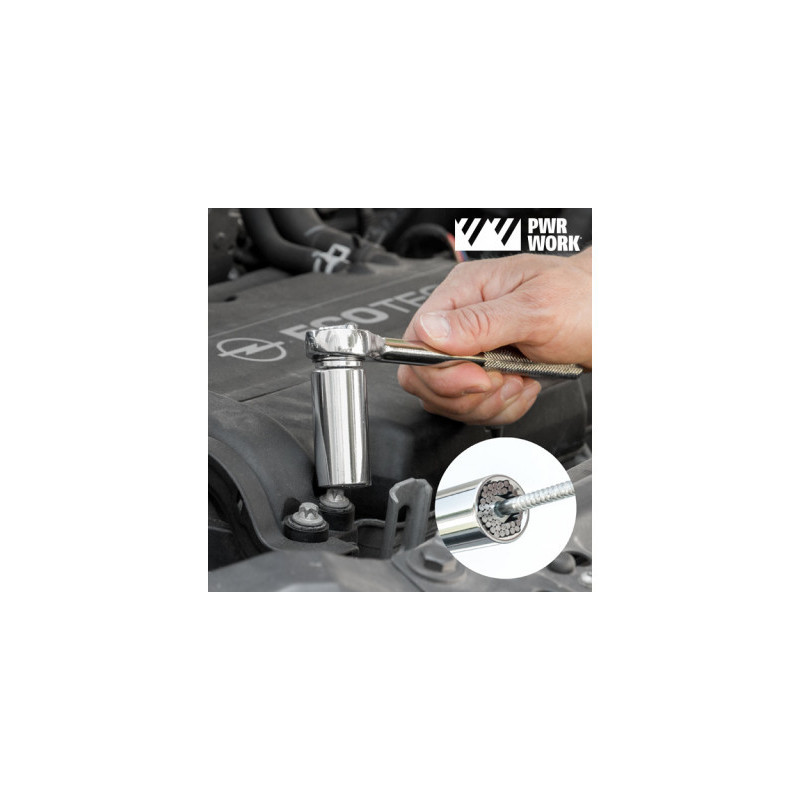 This tool for bolts and nuts replaces a range of wrenches from 1/4″ to 3/4″, metric from 7 to 19 mm. Its 54 steel rods fasten all types of nuts and bolts, even broken or rusty ones (hexagonal, square, butterfly, hook nuts, etc.). A ring wrench encloses a nut or bolt head over the entire perimeter.