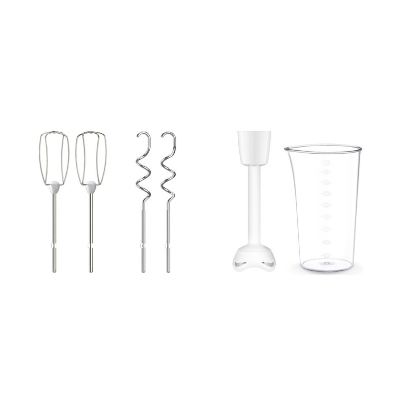 The Tefal HT461138 blender has a 500 W motor with 5 speed settings and a turbo function. Its parts are dishwasher safe and weigh 1.49 kg. Dimensions: 90 mm wide and 150 mm high.
