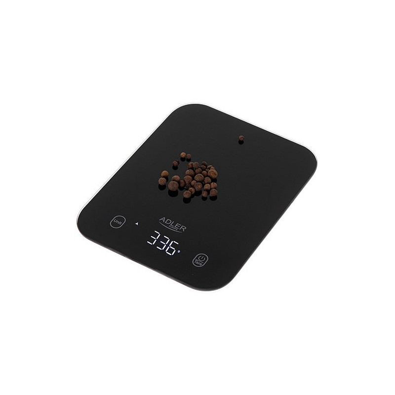 The ADLER AD 3183b kitchen scale has a maximum weight capacity of 5 kg and measures with an accuracy of 1 g. It has an LCD display, an automatic shut-off function, a zero function and uses two CR 2032 batteries.