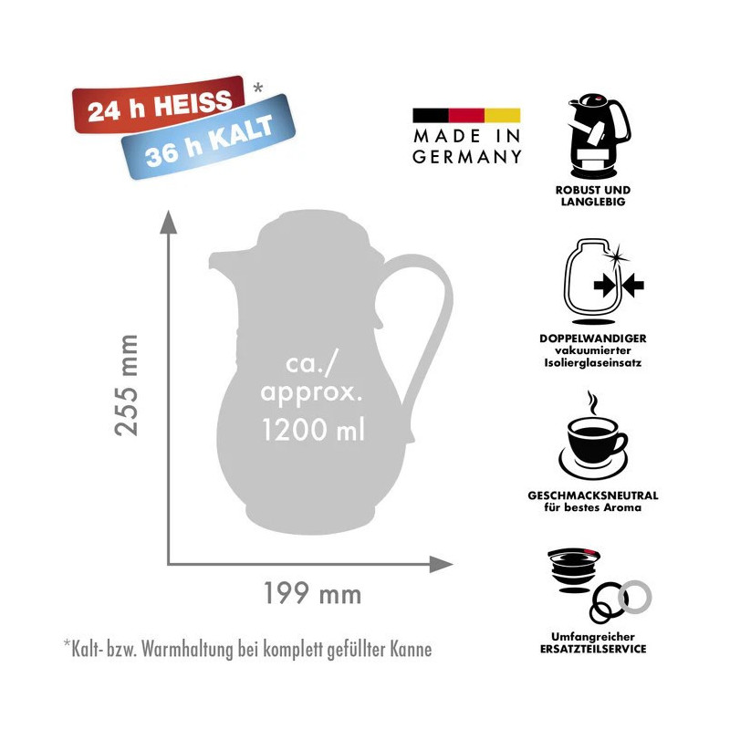 The ROTPUNKT thermos has a capacity of 1.2 liters and can keep liquids hot for up to 24 hours and cold for up to 36 hours. It has a comfortable handle for easy pouring and is available in an ivory color.