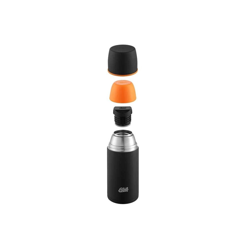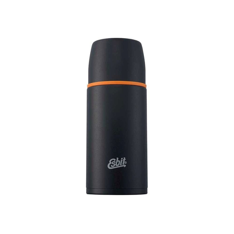 The Thermos ESBIT vacuum bottle has a capacity of 750 ml and is made of stainless steel with double wall insulation. It has two stoppers and is perfect for camping, everyday use, sports and travel.