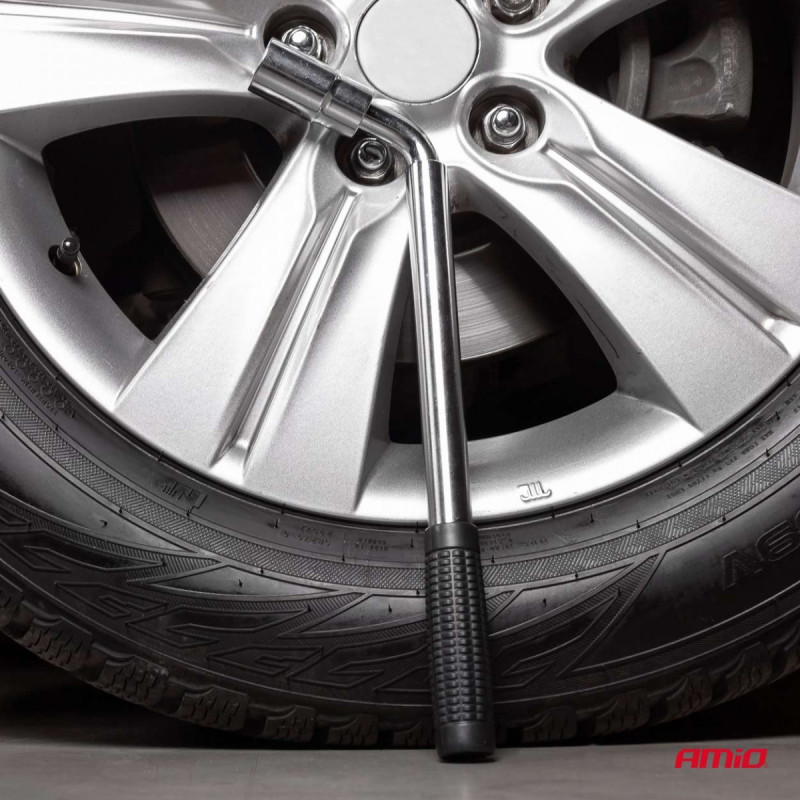 Telescopic wheel wrench with variable length 34-55 cm and large non-slip handle.