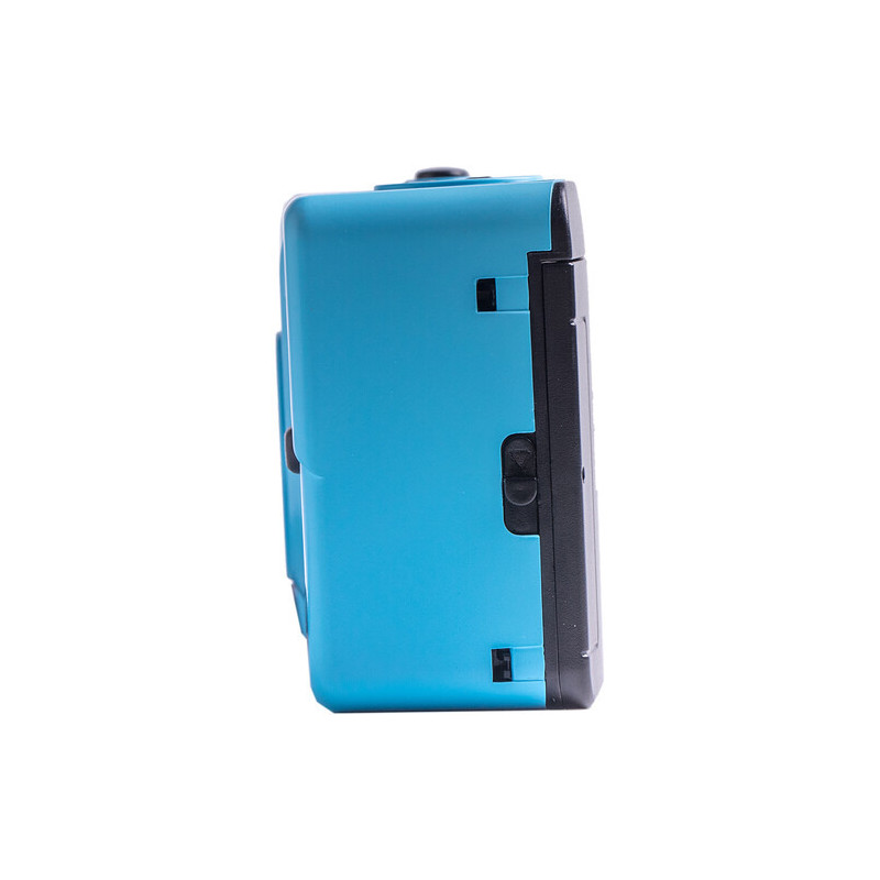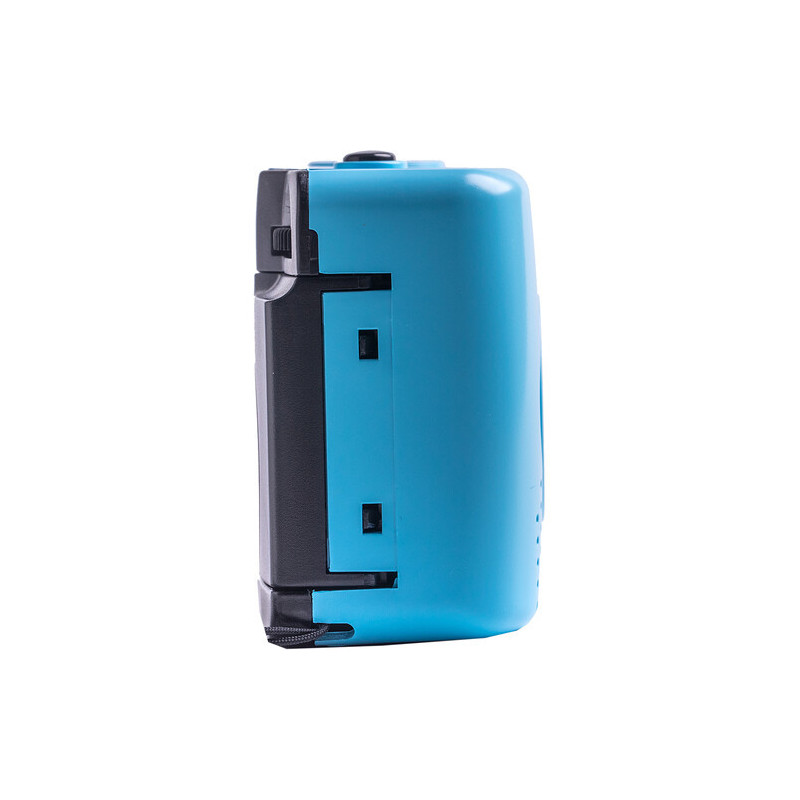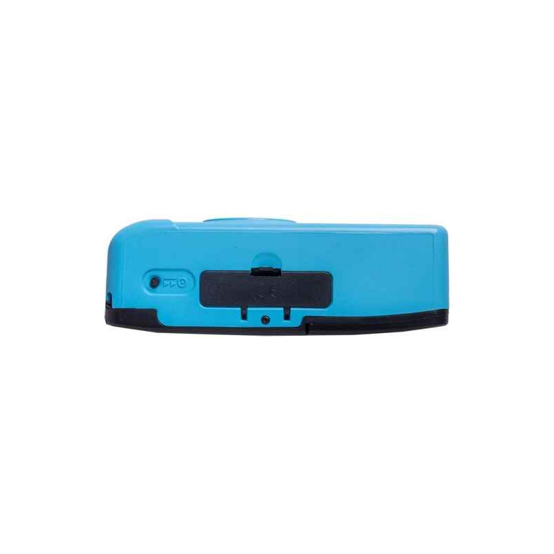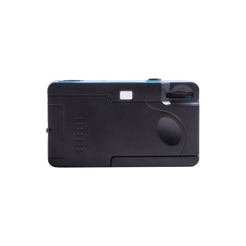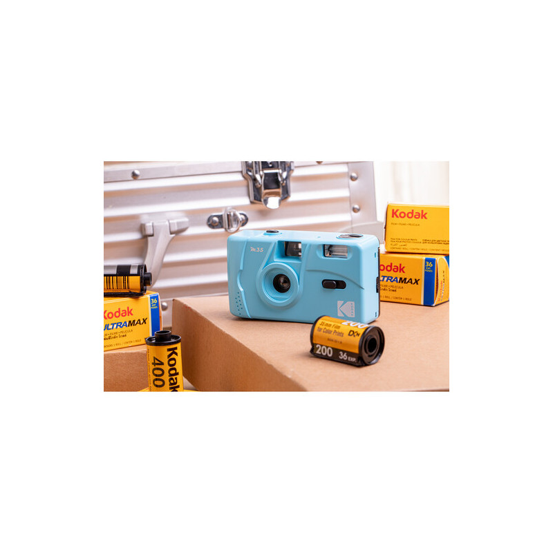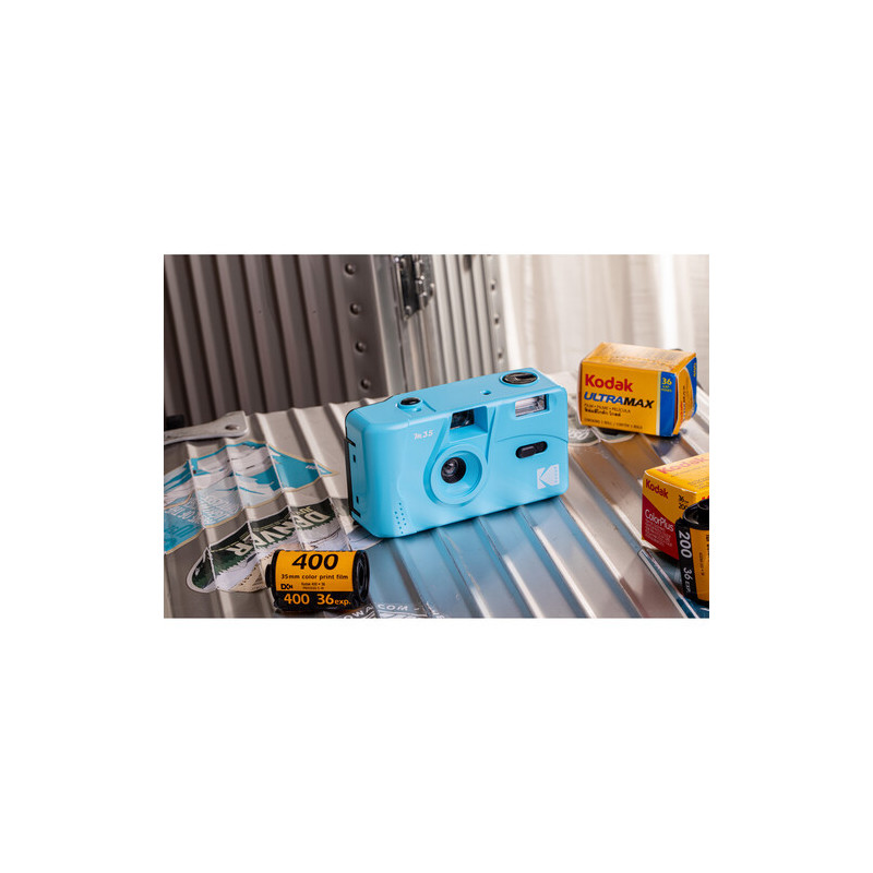 The Kodak M35 Film Camera with Flash in cerulean blue is a small reusable film camera that uses 35mm film. This camera features a 31mm fixed focus lens, manual film winding and rewinding, and a built-in flash with an on/off switch. It is also conveniently powered by one AAA alkaline battery. Load a roll of 35mm film into the camera and take your photos, then rewind the film and have it developed.