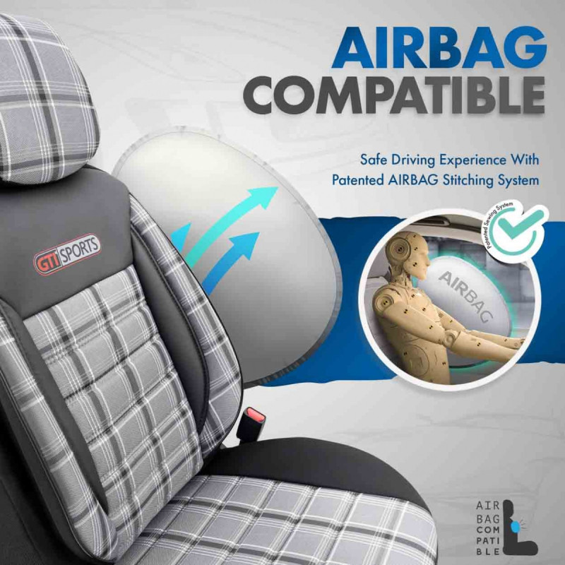 The covers come standard with certified AIRBAG stitching, making them suitable for cars with both side airbags and standard seats. Thanks to the special stitching, they completely cover the seats without interfering with the AIRBAGs.