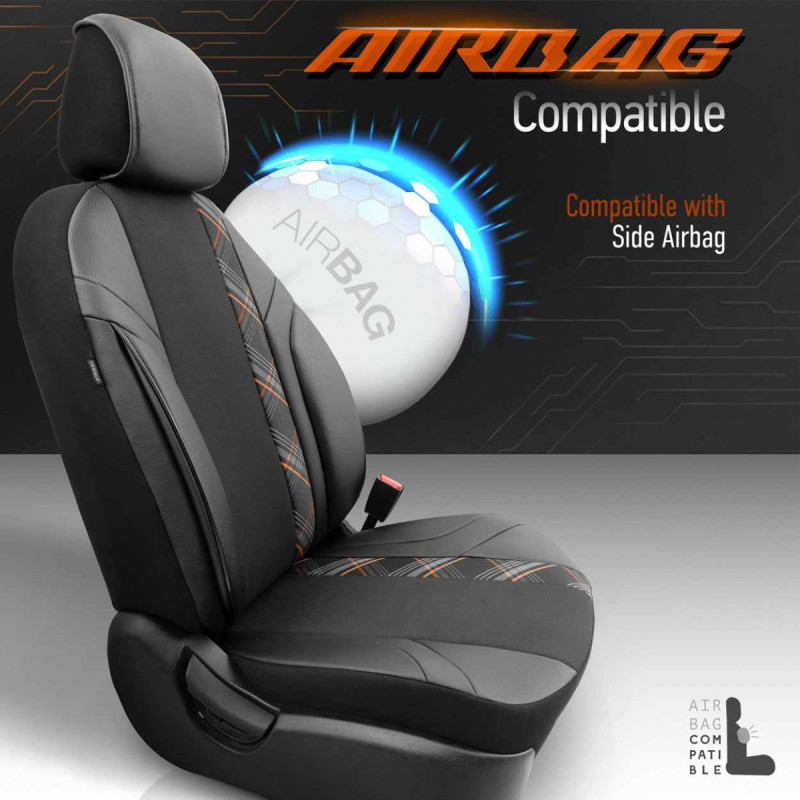 The covers come standard with certified AIRBAG stitching, making them suitable for cars with both side airbags and standard seats. Thanks to the special stitching, they completely cover the seats without interfering with the AIRBAGs.