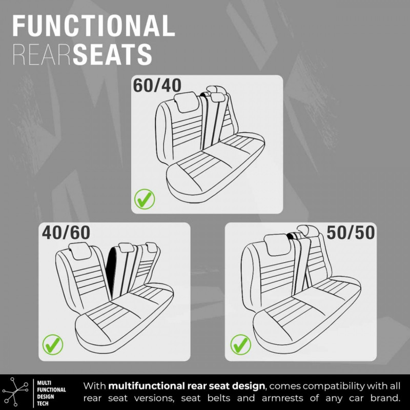The covers have zippers in the rear seats, making them suitable for most seats available on the market (non-split, right- and left-sided split seats). The backrests can be easily folded down to increase cargo space.