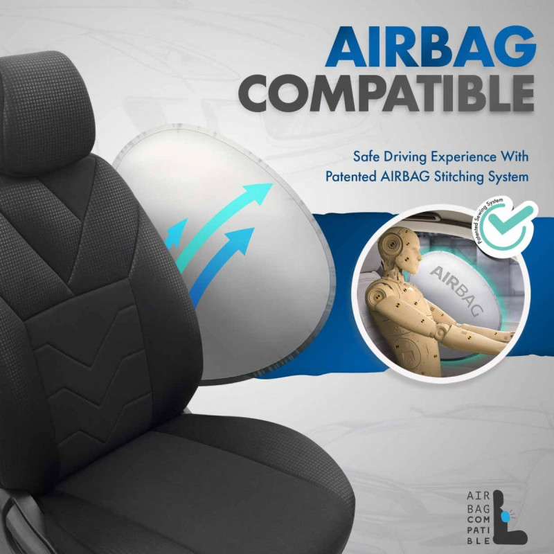 The covers come standard with certified AIRBAG stitching, making them suitable for cars with both side airbags and standard seats. Thanks to the special stitching, they completely cover the seats without interfering with the AIRBAGs.