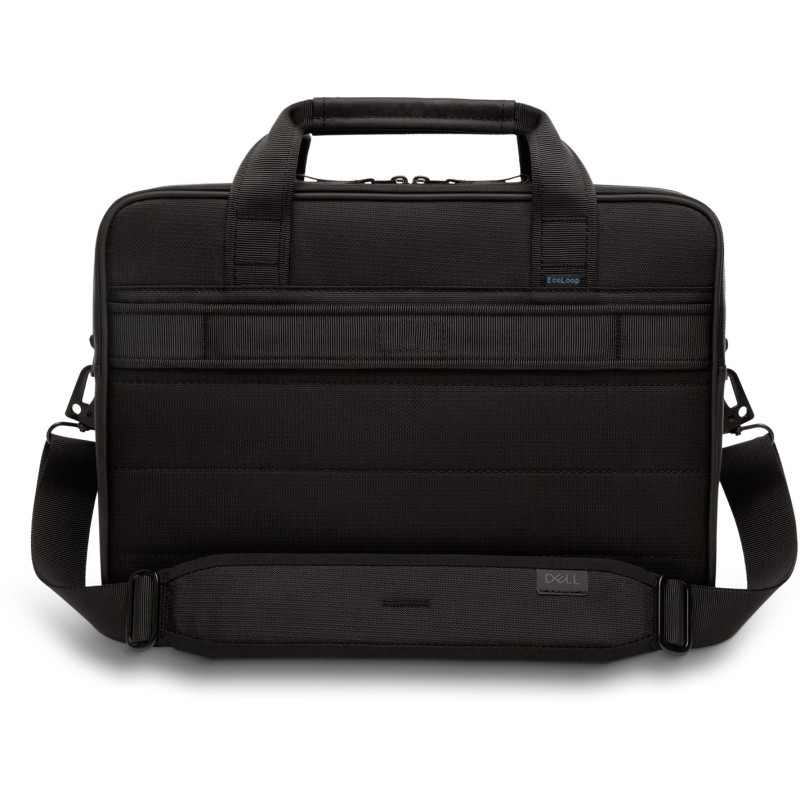 The DELL Pro 13-14 Plus EcoLoop bag is made from 100% recycled materials and has a water-resistant design. It features a front pocket, a removable shoulder strap, and fits laptops up to 14 inches in size.