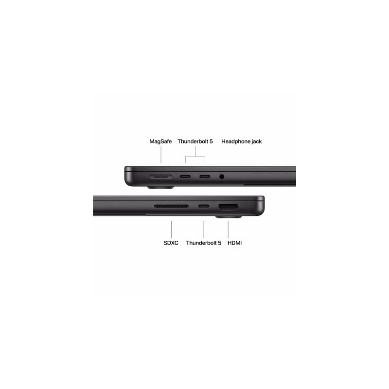 | Thunderbolt | Three Thunderbolt 5 (USB-C) ports with support for: Charging DisplayPort Thunderbolt 5 (up to 120Gb/s) Thunderbolt 4 (up to 40Gb/s) USB 4 (up to 40Gb/ |