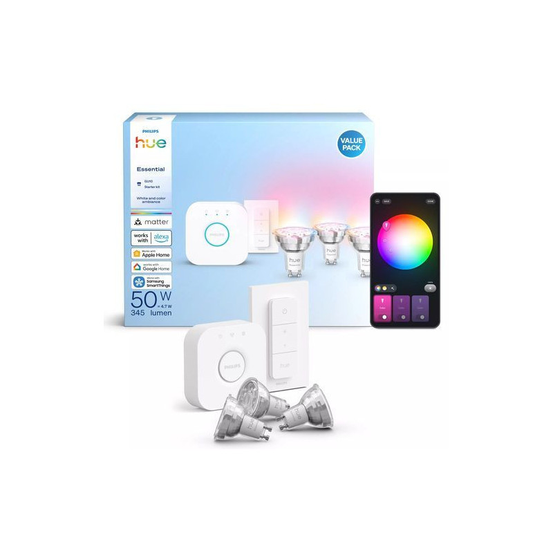 Philips Hue White and colour ambience Essential starter kit: 3 GU10 smart bulbs (345 lm) + dimmer switch. Type: Smart lighting kit, Interface: Bluetooth/Zigbee, Product colour: White. Energy efficiency class: F, Power consumption (standby): 0.5 W, Power consumption (max): 4.7 W. Height: 55 mm, Weight: 50 g, Diameter: 5 cm. Package width: 176 mm, Package depth: 219 mm, Package height: 140 mm. Quantity per pack: 5 pc(s), Cables included: LAN (RJ-45), Number of hue bulb(s) included: 3 bulb(s)