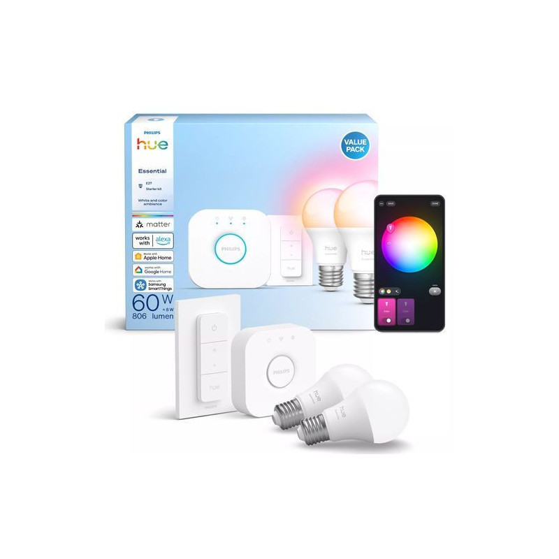 Philips Hue White and colour ambience Essential starter kit: 2 E27 smart bulbs (806 lm) + dimmer switch. Type: Smart lighting kit, Interface: Bluetooth/Zigbee, Product colour: White. Mobile operating systems supported: Android, iOS. Energy efficiency class: F, Power consumption (standby): 0.5 W, Power consumption (max): 8 W. Width: 60 mm, Height: 111 mm, Weight: 50 g. Package type: Box, Package width: 176 mm, Package depth: 219 mm