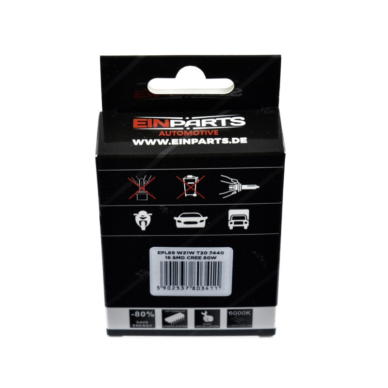 Bulb characteristics: - W21W / T20 - Operating voltage: 12V - Light color: white - Operating temperature: -40C to +50C - Power: 80W - 16 CREE LEDs Advantages: - lower power consumption - high efficiency - no warm-up time required - low temperature during lighting - burnout resistant - service life up to 50,000 hours