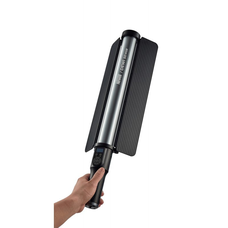 The Newell Dewi 50 RGB LED light features a 60cm long design with adjustable color temperature from 2700K to 10000K and a high CRI ≥ 97 for accurate color reproduction. It includes 20 special effects, a removable barn door for light direction control, and can be powered via the USB-C port or the included power adapter.