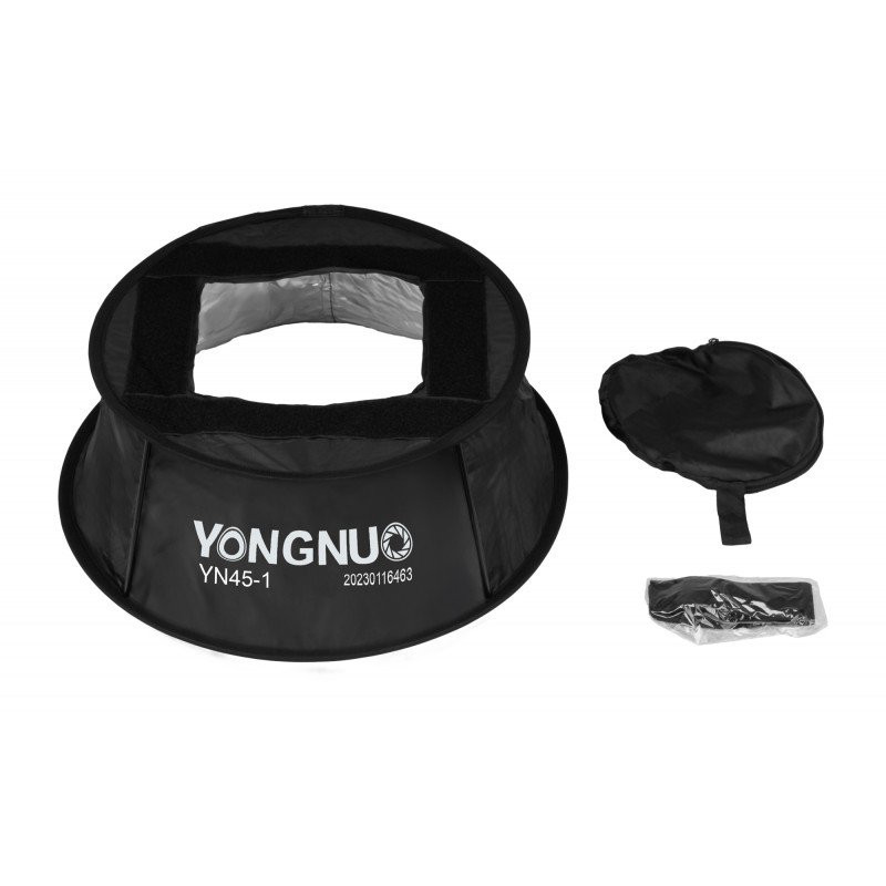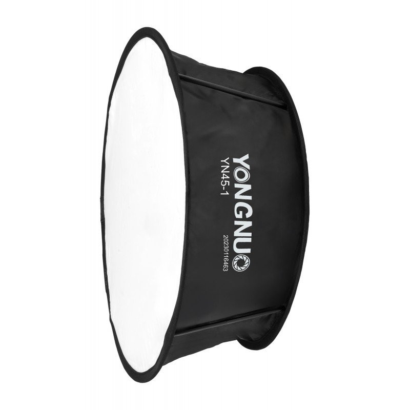 The Yongnuo YN45-1 softbox is a compact and powerful 45cm diameter light modifier designed to work with Yongnuo YN300 series lights. It provides soft, eye-pleasing lighting. This will get rid of harsh shadows that can negatively affect the quality of your photos and videos. Its silver interior effectively reflects light, acting as a reflector. At the same time, a layer of white material provides optimal softness. A quick flick of the wrist is enough to unfold the Yongnuo YN45-1 softbox, and the sturdy Velcro fasteners allow for instant and secure attachment of the flash. It also comes with a practical carrying case that is easy to store and transport.