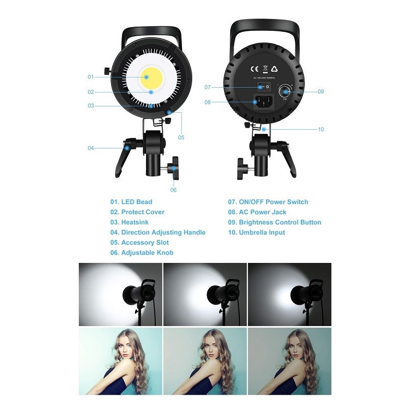 The constant light lamp is designed for photo studios, but can also be used at home or outdoors for video filming, photography or live broadcasting, children's photoshoots, costume portraits, wedding photos, e-commerce product presentations, exhibitions, online broadcasting, etc. The lamp features a high-quality, constant 5600K light temperature and a high color rendering index > 97.
