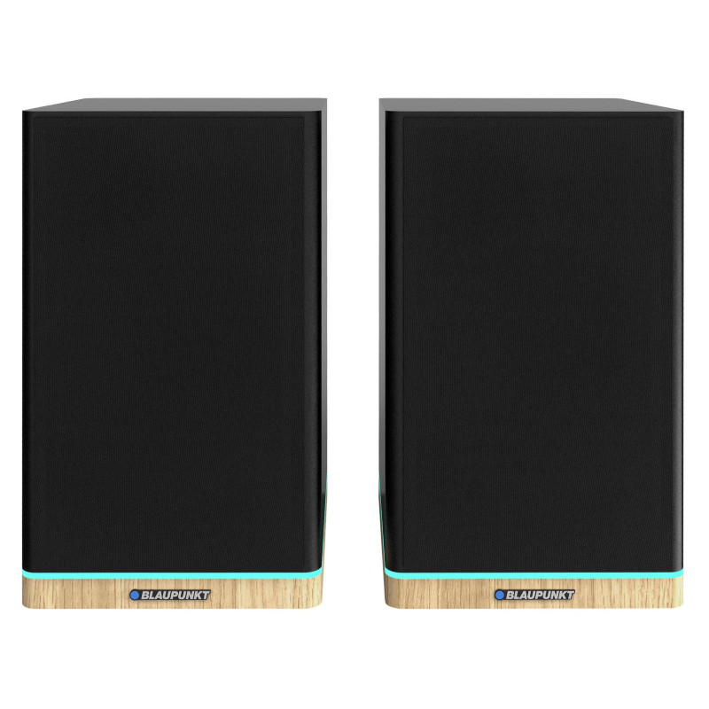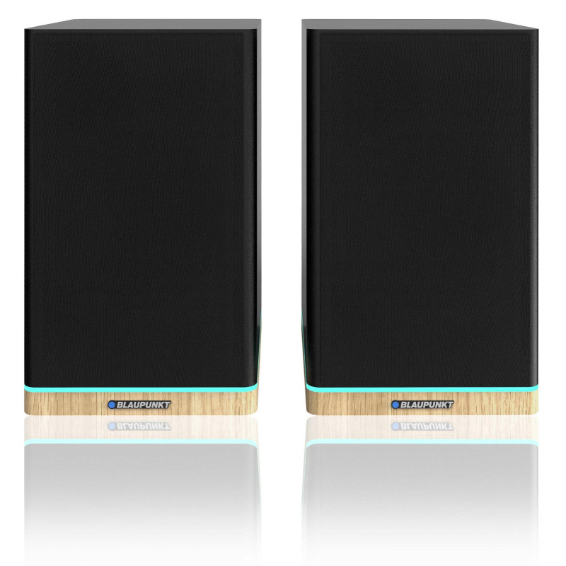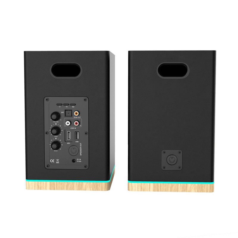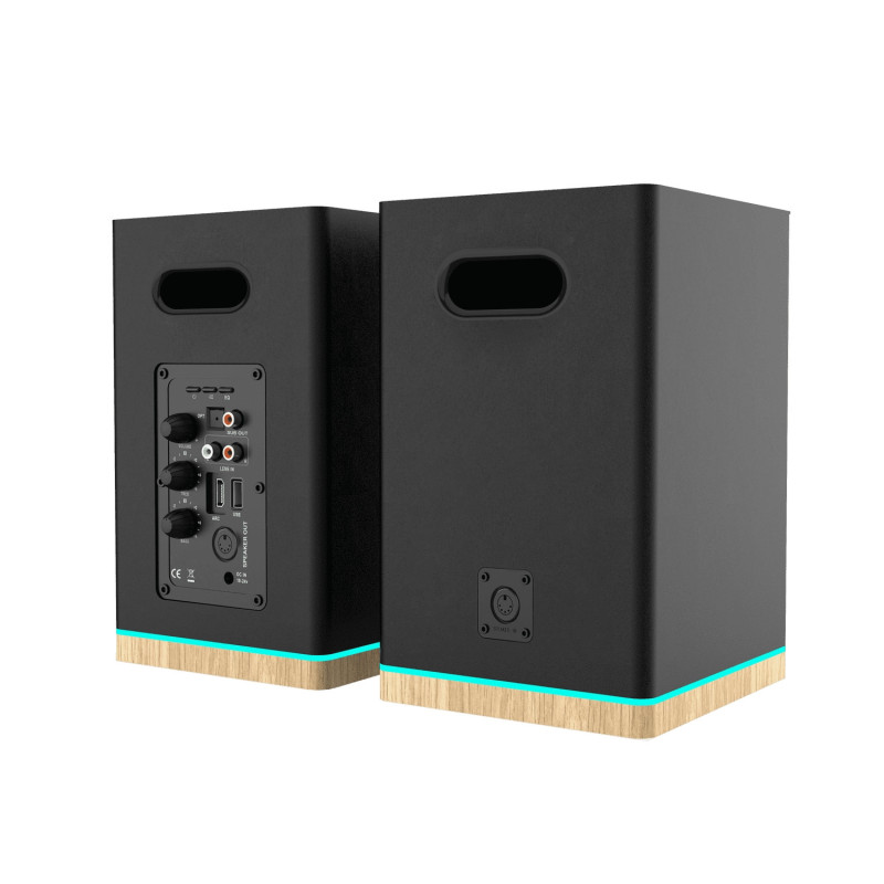 The speakers have a bass-reflex housing and a remote control for convenient operation and LED lights for better visual effect.