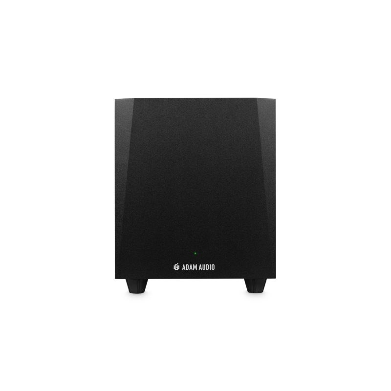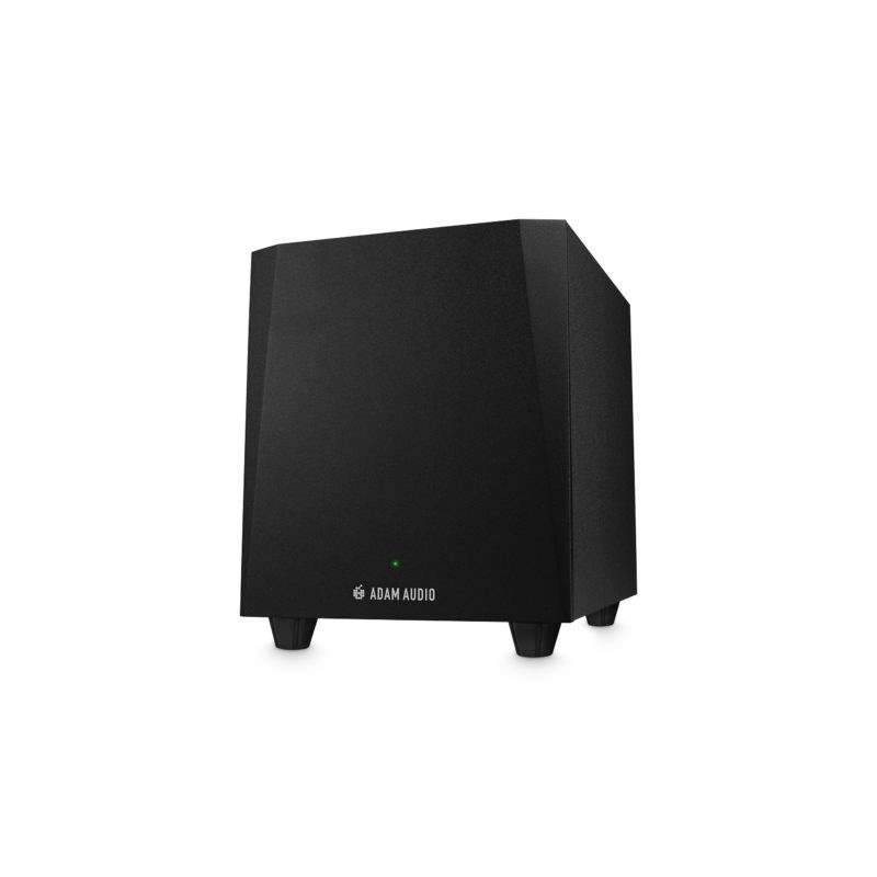 Adam T10S subwoofer with 130 W power. It features a black finish and is designed to reproduce deep bass.