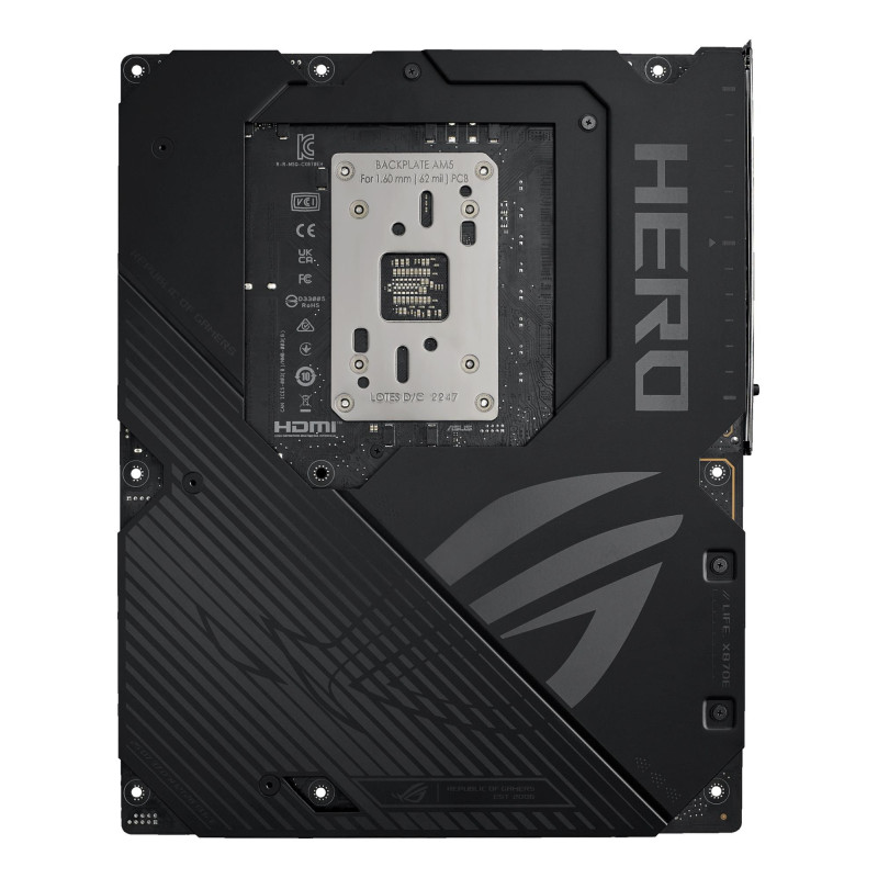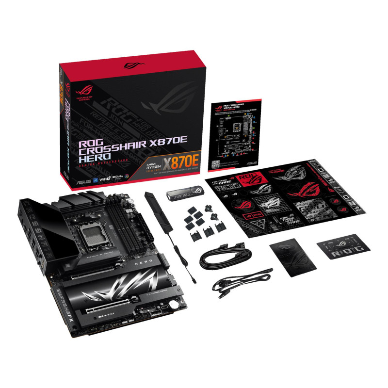 | Summary | ASUS ROG CROSSHAIR X870E HERO. Processor manufacturer: AMD, Processor socket: Socket AM5, Supported processor sockets: Socket AM5. Supported memory types: DDR5-SDRAM, Maximum internal memory: 192 GB, Memory slots type: DIMM. Supported storage drive interfaces: M.2, SATA III, SlimSAS, Supported storage drive types: HDD & SSD, RAID levels: 0, 1, 10, 5. Ethernet interface type: 2.5 Gigabit Ethernet, 5 Gigabit Ethernet, Top Wi-Fi standard: Wi-Fi 7 (802.11be), Wi-Fi standards: Wi-Fi 7 (802.11be). Component for: PC, Motherboard form factor: ATX, Motherboard chipset family: AMD |