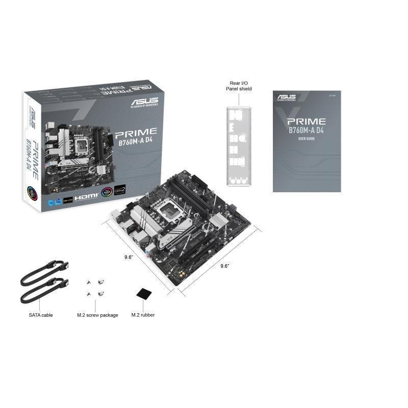 | Summary | ASUS PRIME B760M-A D4-CSM. Processor manufacturer: Intel, Processor socket: LGA 1700, Compatible processor series: Intel® Celeron®, Intel® Pentium® Gold, Intel® Core™ i3, Intel® Core™ i5, Intel® Core™.... Supported memory types: DDR4-SDRAM, Maximum internal memory: 128 GB, Memory slots type: DIMM. Supported storage drive interfaces: M.2, SATA III, Supported storage drive types: HDD & SSD, RAID levels: 0, 1, 5, 10. Ethernet interface type: 2.5 Gigabit Ethernet. Component for: PC, Motherboard form factor: micro ATX, Motherboard chipset family: Intel |