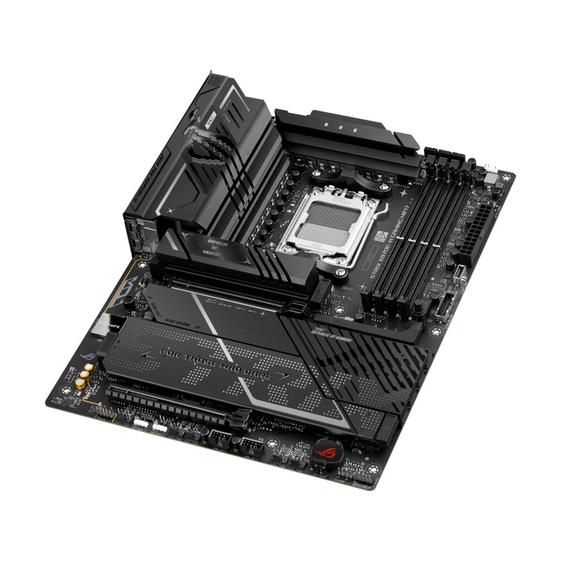 | Summary | ASUS ROG STRIX X870E-H GAMING WIFI7. Processor manufacturer: AMD, Processor socket: Socket AM5, Compatible processor series: AMD Ryzen 7000 Series, AMD Ryzen 8000 Series, AMD Ryzen 9000 Series. Supported memory types: DDR5-SDRAM, Maximum internal memory: 256 GB, Memory slots type: DIMM. Supported storage drive interfaces: M.2, SATA III, Supported storage drive types: HDD & SSD, RAID levels: 0, 1, 10, 5. Ethernet interface type: 5 Gigabit Ethernet, Top Wi-Fi standard: Wi-Fi 7 (802.11be), Wi-Fi standards: Wi-Fi 7 (802.11be). Component for: PC, Motherboard form factor: ATX, Motherboard chipset family: AMD |
