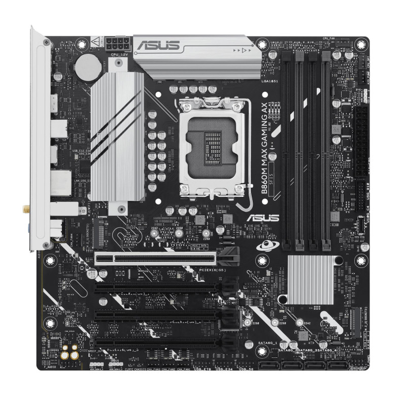 ASUS B860 series motherboards are expertly engineered to unleash the full potential of the latest Intel® Core™ Ultra Processors (Series 2). Boasting a robust power design, comprehensive cooling solutions and intelligent tuning options, the B860M MAX GAMING AX motherboard provides users and PC DIY builders with a range of performance optimizations via intuitive software and firmware features. It's designed to be Advanced AI PC-ready, offering the power and connectivity needed for demanding AI applications.