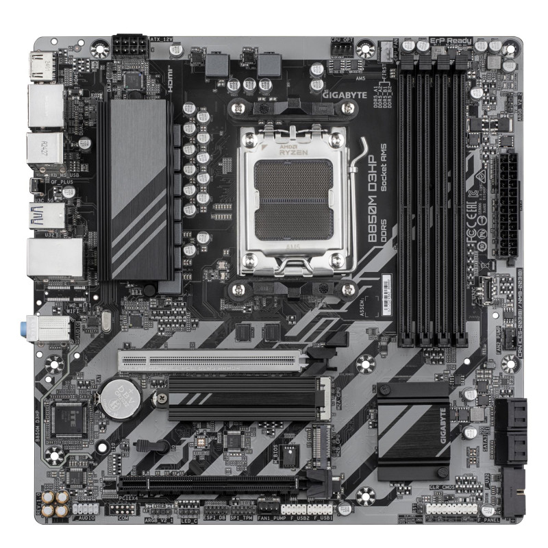 | Summary | GIGABYTE B850M D3HP Motherboard - AMD Ryzen 9000 Series CPUs, 5+2+2 Phases Digital VRM, up to 8200MHz DDR5 (OC), 1xPCIe 5.0 + 1xPCIe 4.0 M.2, GbE LAN, USB 3.2 Gen 2. Processor manufacturer: AMD, Processor socket: Socket AM5, Compatible processor series: AMD Ryzen 7000 Series, AMD Ryzen 8000 Series, AMD Ryzen 9000 Series. Supported memory types: DDR5-SDRAM, Maximum internal memory: 256 GB, Memory slots type: DIMM. Supported storage drive interfaces: M.2, SATA III, Supported storage drive types: HDD & SSD, RAID levels: 0, 1, 10. Maximum resolution: 4096 x 2160 pixels. Ethernet interface type: Gigabit Ethernet |
