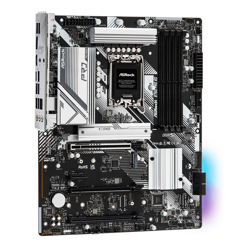 The Asrock B760 PRO RS is an ATX motherboard compatible with Intel LGA 1700 processors, supporting up to 256GB of DDR5 memory. It features integrated Intel Iris Xe graphics, multiple USB ports, and 2.5 Gigabit Ethernet connectivity.