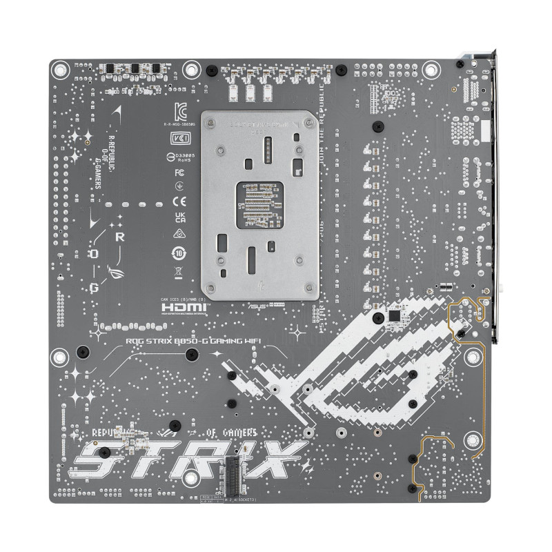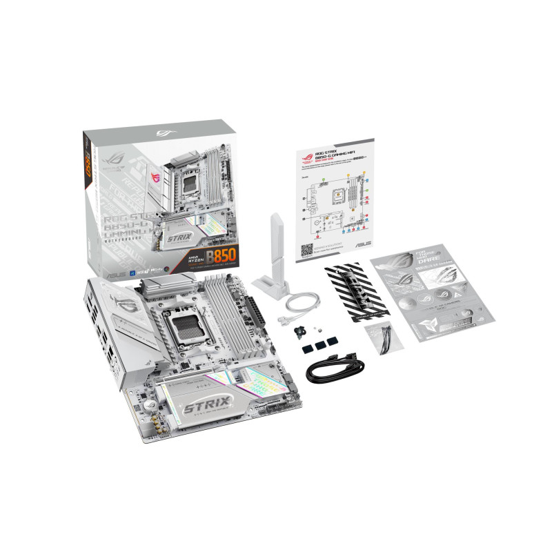 | Summary | ASUS ROG STRIX B850-G GAMING WIFI. Processor manufacturer: AMD, Processor socket: Socket AM5, Compatible processor series: AMD Ryzen 7000 Series, AMD Ryzen 8000 Series, AMD Ryzen 9000 Series. Supported memory types: DDR5-SDRAM, Maximum internal memory: 256 GB, Memory slots type: DIMM. Supported storage drive interfaces: M.2, SATA III, Supported storage drive types: HDD & SSD, RAID levels: 0, 1, 5, 10. Ethernet interface type: 2.5 Gigabit Ethernet, Top Wi-Fi standard: Wi-Fi 7 (802.11be), Wi-Fi standards: Wi-Fi 7 (802.11be). Component for: PC, Motherboard form factor: micro ATX, Motherboard chipset family: AMD |